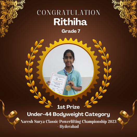 We take immense pride in sharing that Rithiha of grade 7 participated in Naresh Surya Classic Powerlifting Championship 2023 held in Hyderabad and won 1st prize in the under-44 bodyweight category.