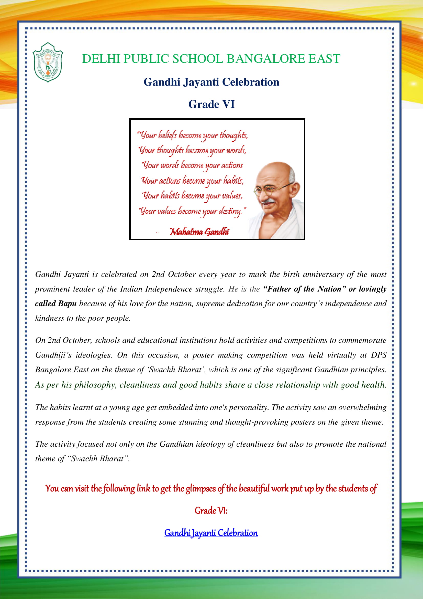 Gandhi Jayanti Celebrations Grade VI Share: Previous post Gandhi Jayanti Celebrations Grade V Next post Melange 2020-The Virtual Literary Fest-Grade VII